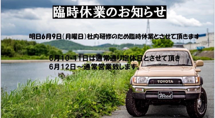 明日6月9日(月曜日)社内研修のため臨時休業とさせて頂きます。