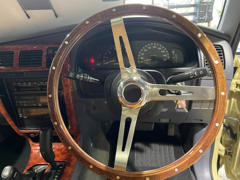 シートカバーがコーデュロイでビットのウッドステアリング装着